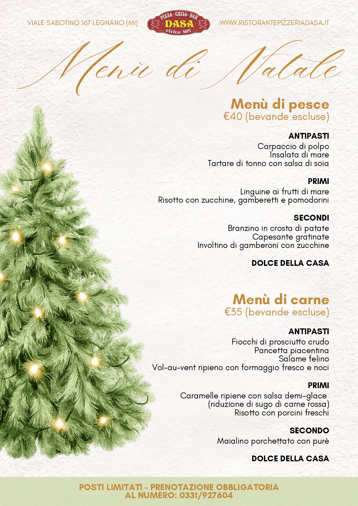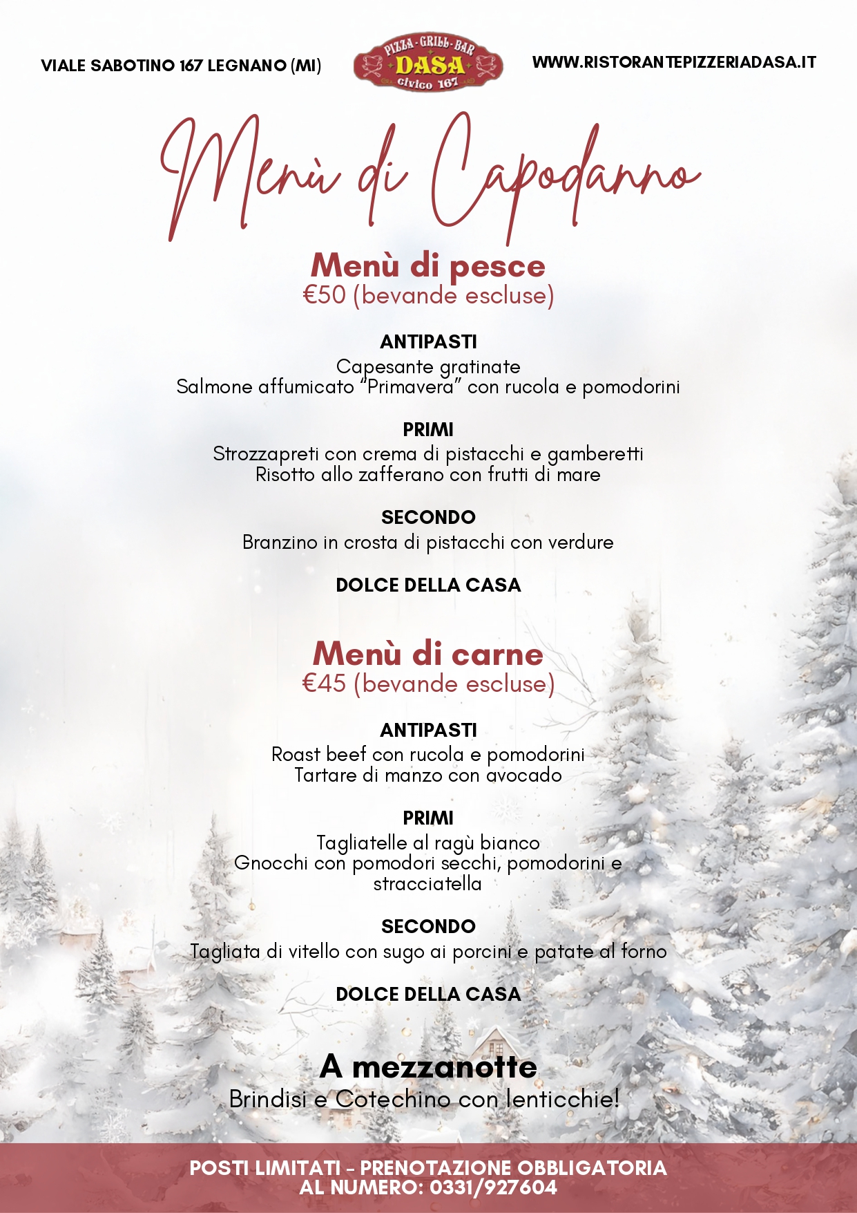 Vivi la magia delle feste con i menù di Natale e Capodanno del ristorante Dasa 167 a Legnano. In un’atmosfera calda ed elegante, potrai gustare piatti ricercati preparati con ingredienti di stagione e un tocco creativo che rende ogni portata speciale.